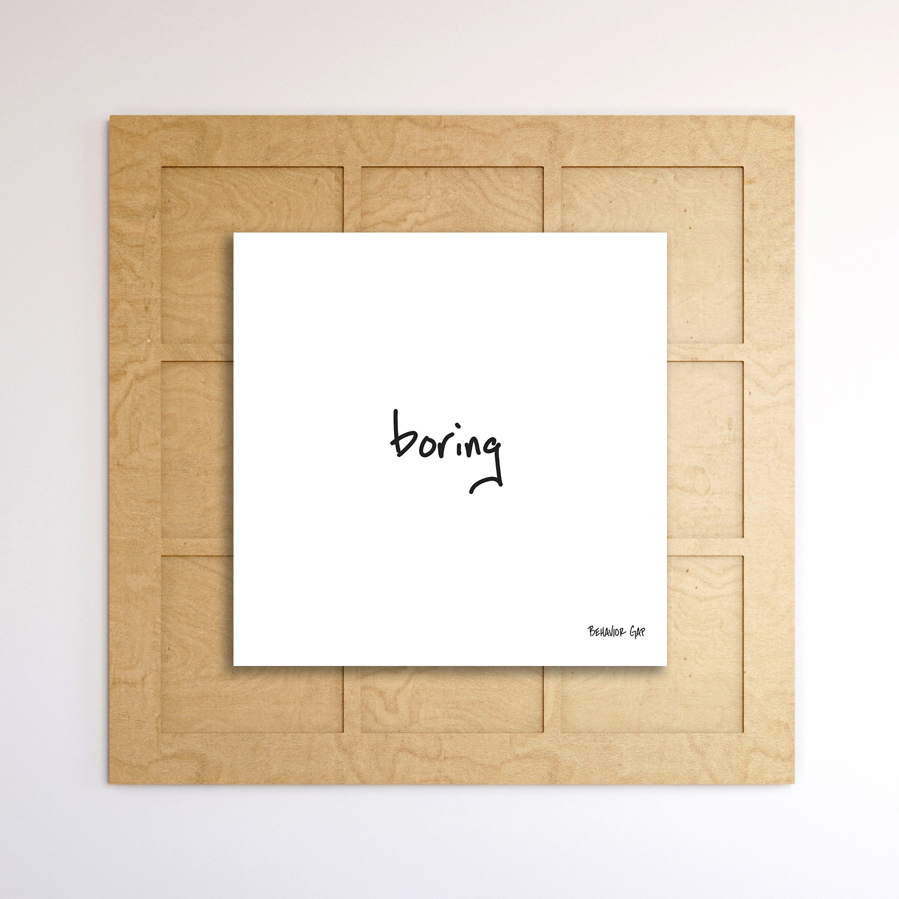 3:3 PANEL made from premium wood with 1/4" premium floating white-faced lam, direct printed. Surrounding tiles (all 8) and art module easily swap out to update with alternate Behavior Gap sketches!