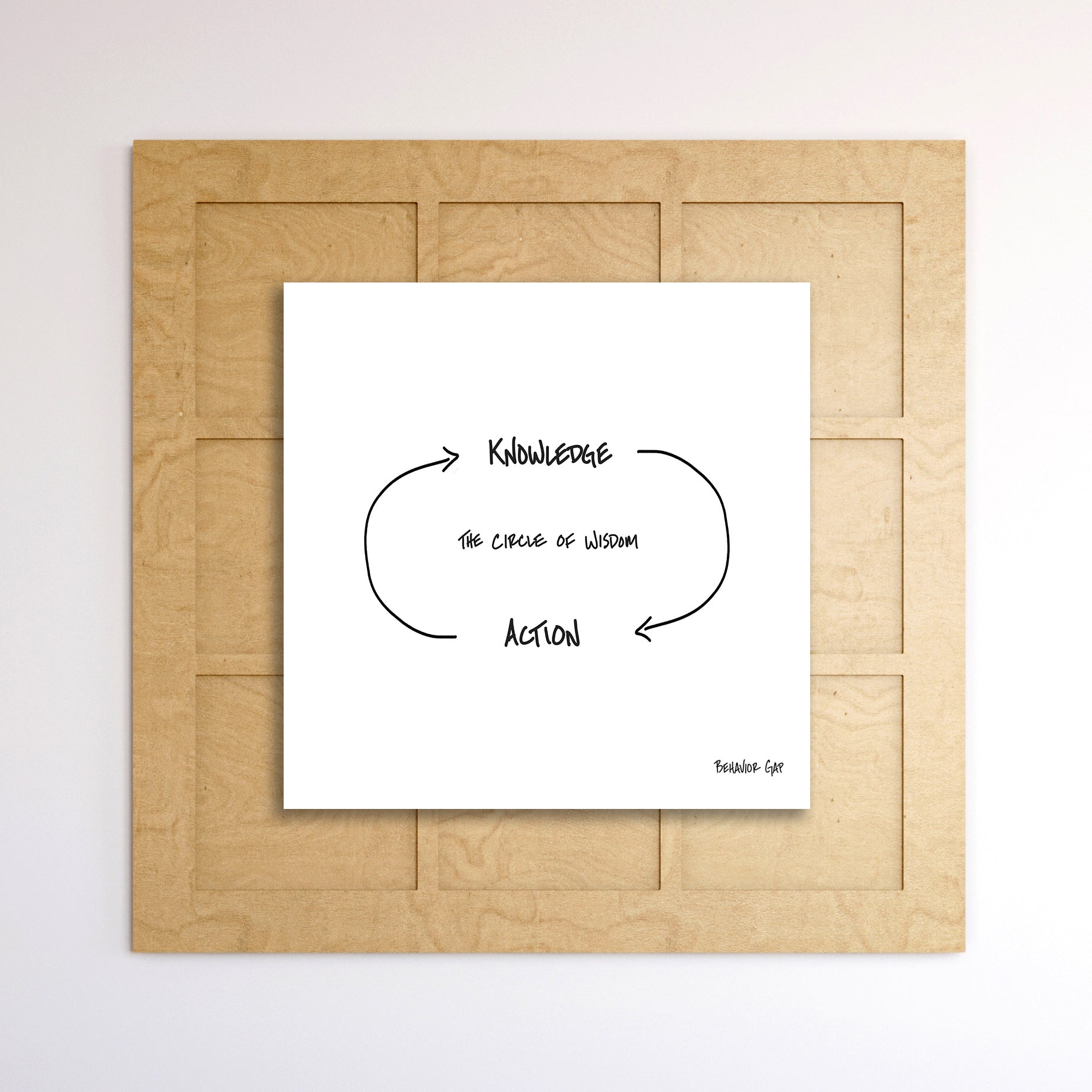 3:3 PANEL made from premium wood with 1/4" premium floating white-faced lam, direct printed. Surrounding tiles (all 8) and art module easily swap out to update with alternate Behavior Gap sketches!