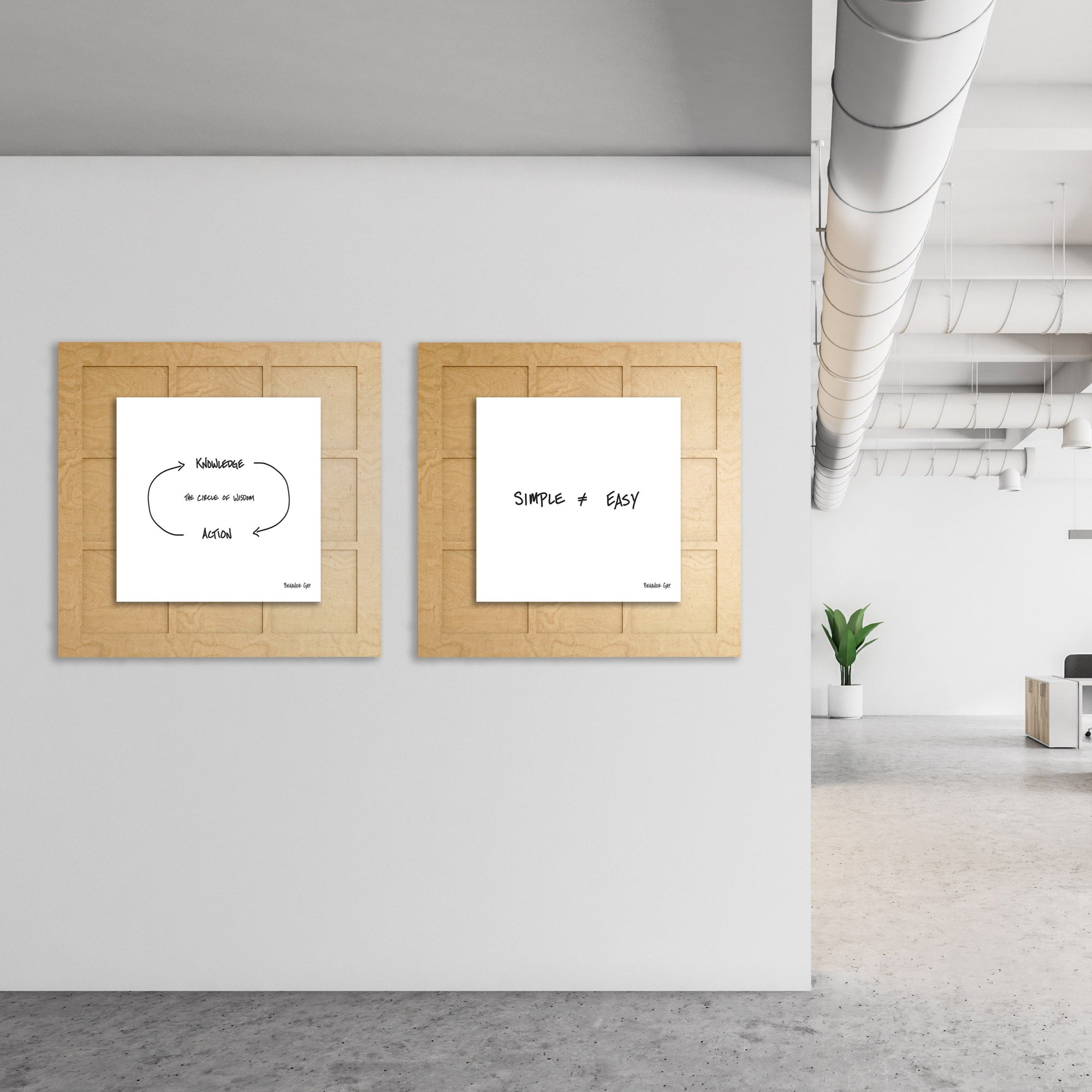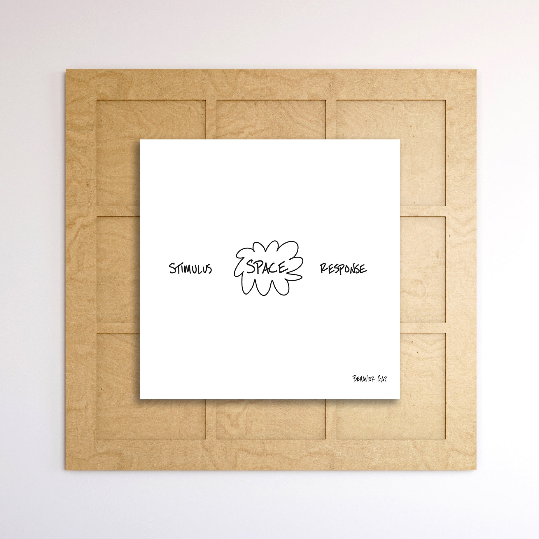 3:3 PANEL made from premium wood with 1/4" premium floating white-faced lam, direct printed. Surrounding tiles (all 8) and art module easily swap out to update with alternate Behavior Gap sketches!