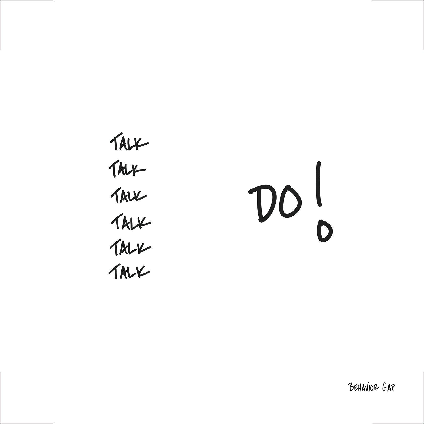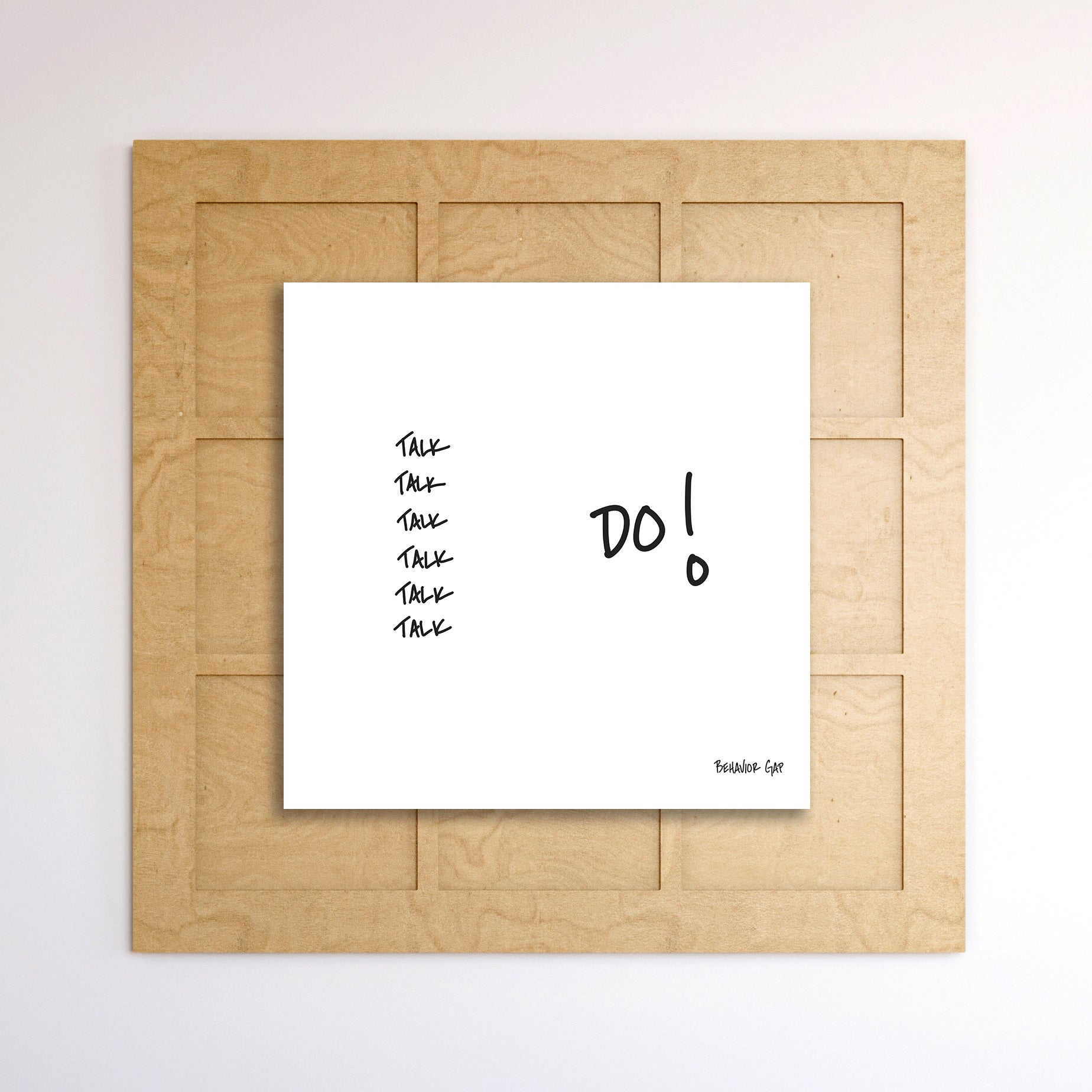 3:3 PANEL made from premium wood with 1/4" premium floating white-faced lam, direct printed. Surrounding tiles (all 8) and art module easily swap out to update with alternate Behavior Gap sketches!