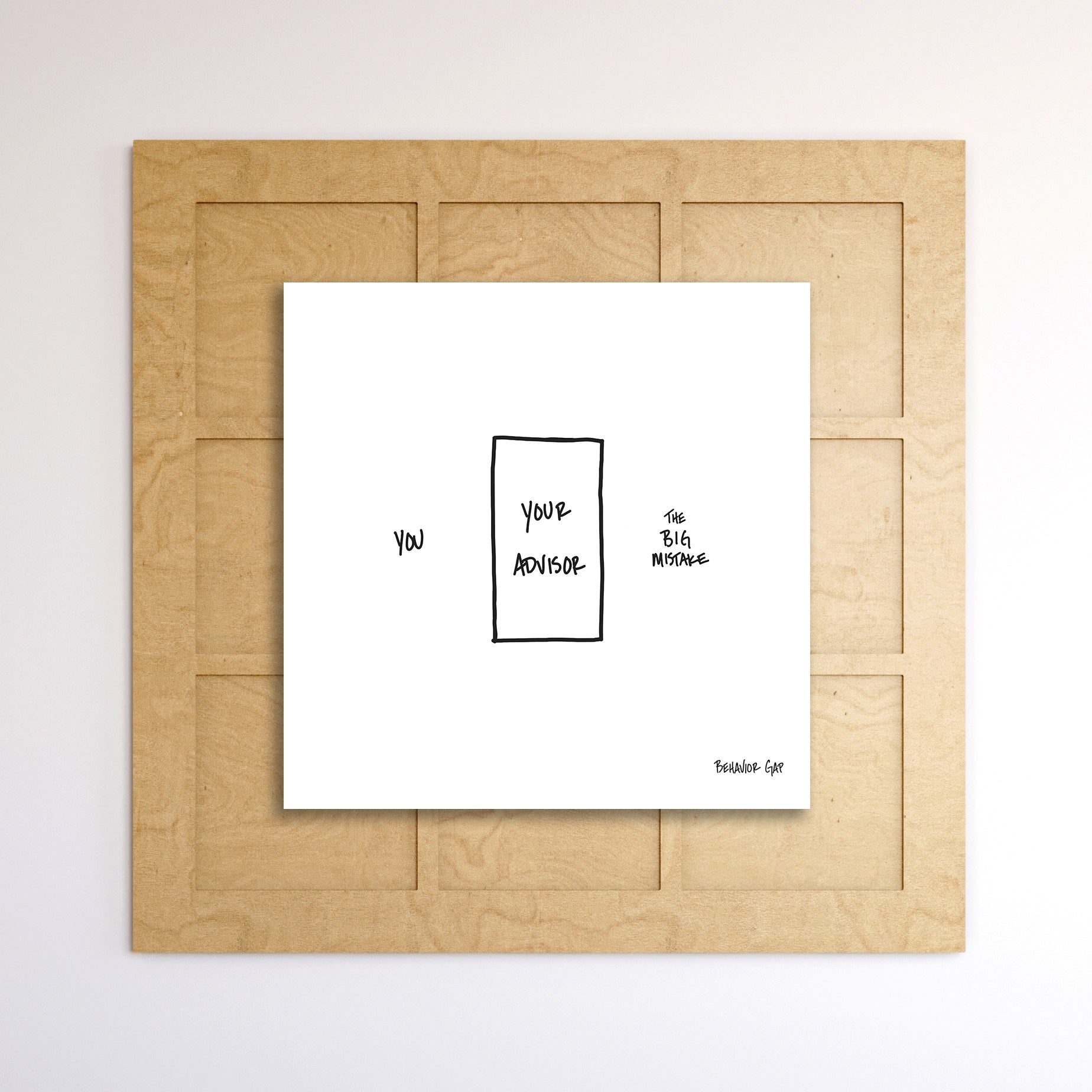 3:3 PANEL made from premium wood with 1/4" premium floating white-faced lam, direct printed. Surrounding tiles (all 8) and art module easily swap out to update with alternate Behavior Gap sketches!